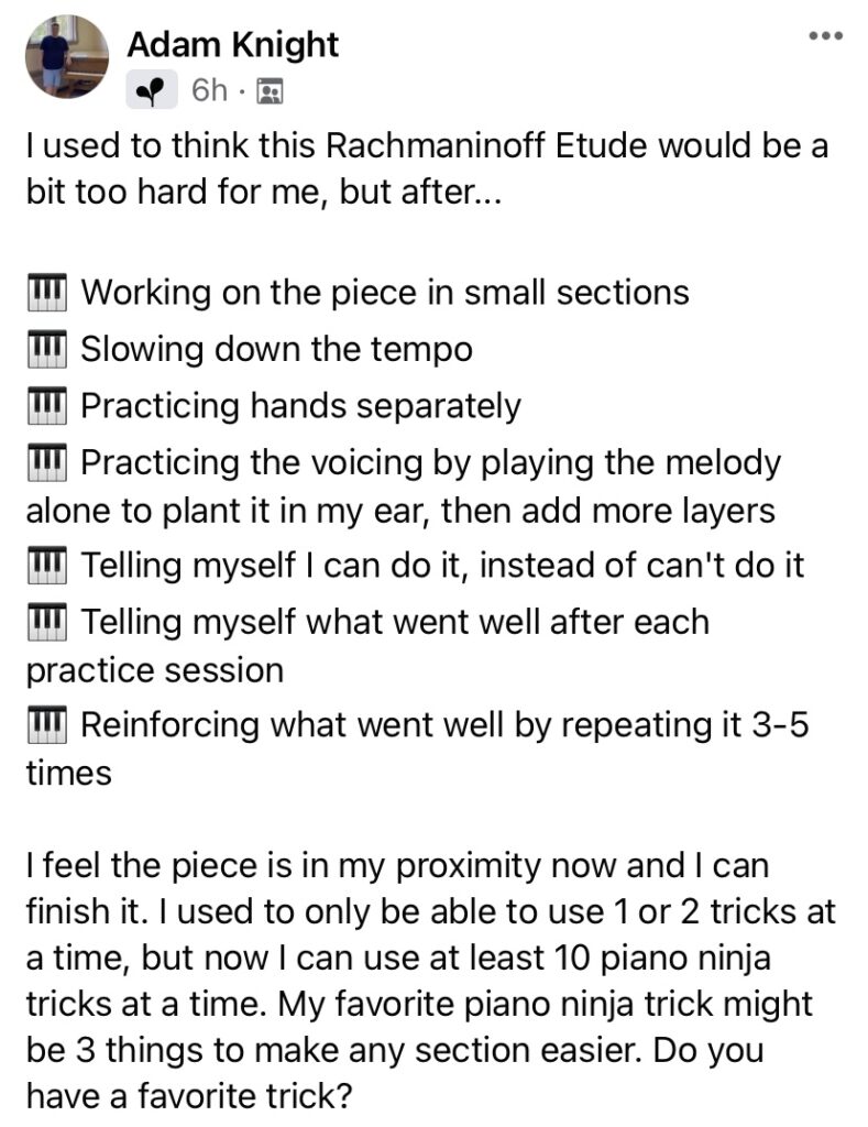 This isn’t theory, it’s proven. Just ask Adam Knight, who went from playing a Clementi Sonatina to tackling Liszt’s Dante Sonata. With Piano Ninja Tricks, Adam discovered how to practice smarter, not longer, and unlocked a level of playing he never thought possible.